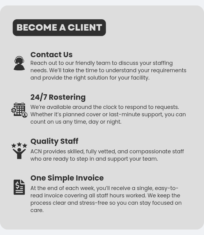 Join ACN today and experience the support, flexibility, and rewards that come with being part of a leading nursing agency. We are committed to supporting our members by providing excellent opportunities in aged care facilities and various other healthcare settings.